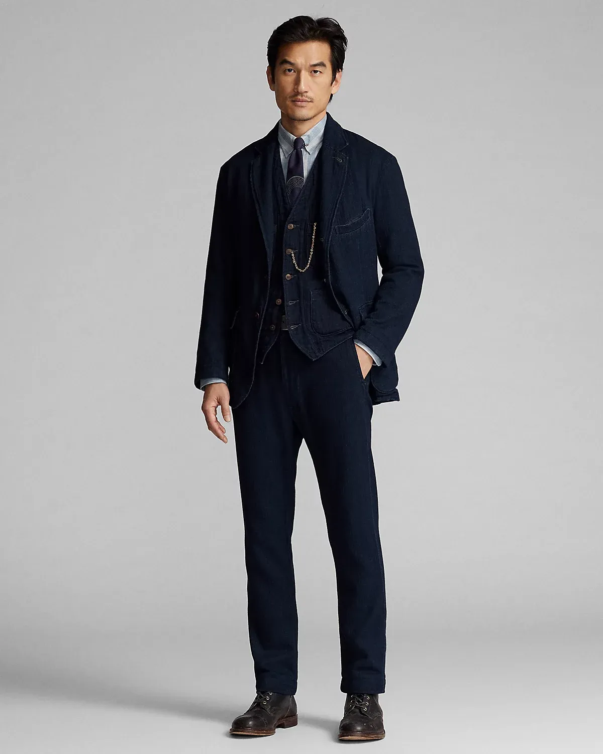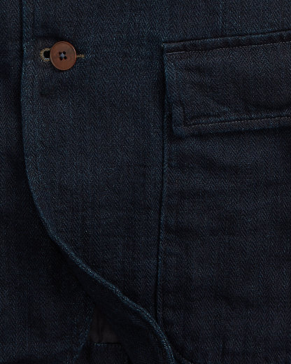 Made with Japanese cotton herringbone that is yarn-dyed with indigo. Half-lined. Corozo divs.