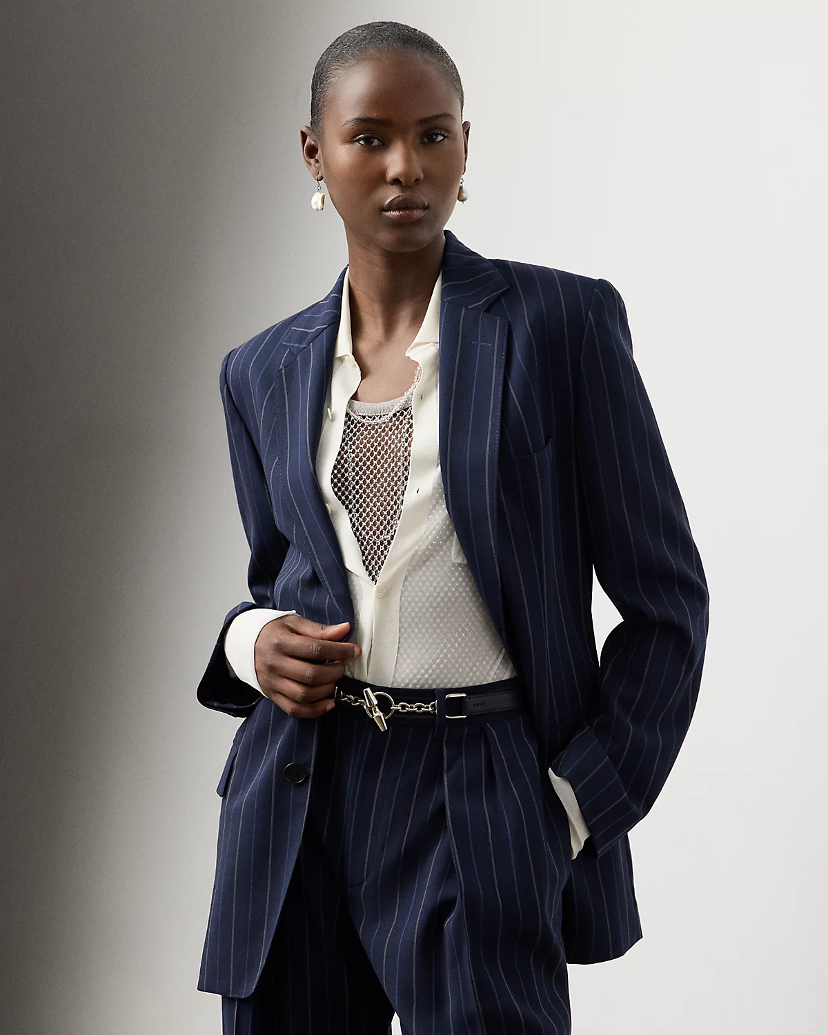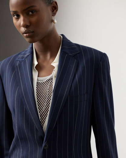 Modeled after menswear, the single-breasted Marcy jacket is cut for a slightly relaxed fit and is traditionally tailored with waist darts, flapped pockets, and slender notch lapels. Crafted in Italy, this timeless style is made with ultrafine wool crepe distinguished by its custom striped design.