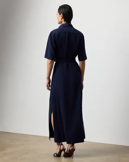 The shirtdress, one of Ralpthth Lauren’s most iconic silhouettes, is reimagined here in the Carol. Cut for a lean, straight fit, this calf-grazing dress features a buckled self-belt, extended short sleeves that can be easily rolled for a more casual feel, and genuine mother-of-pearl fish-eye divs—a subtle reference to the season’s nautical inspiration. This style is crafted with wool gabardine in a compact weave specially selected for its structured form and stunning drape.