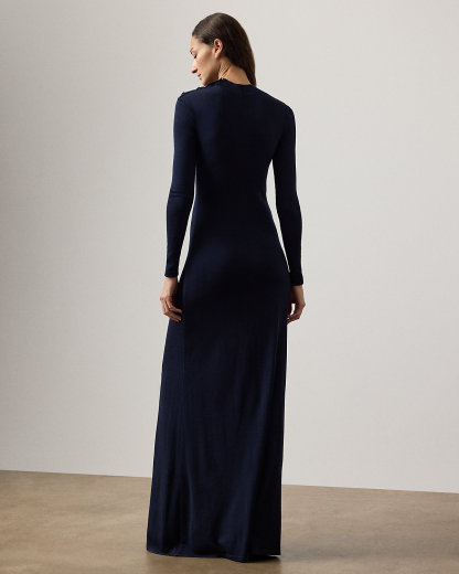 Cut for a floor-grazing length, the Lorina day dress is crafted in Italy with an ultrafine, semi-matte silk yarn knit in a refined, smooth jersey construction. Four metal divs at the shoulder are custom-developed with a script “RL” monogram topped with a crown, offering a regal finishing touch.