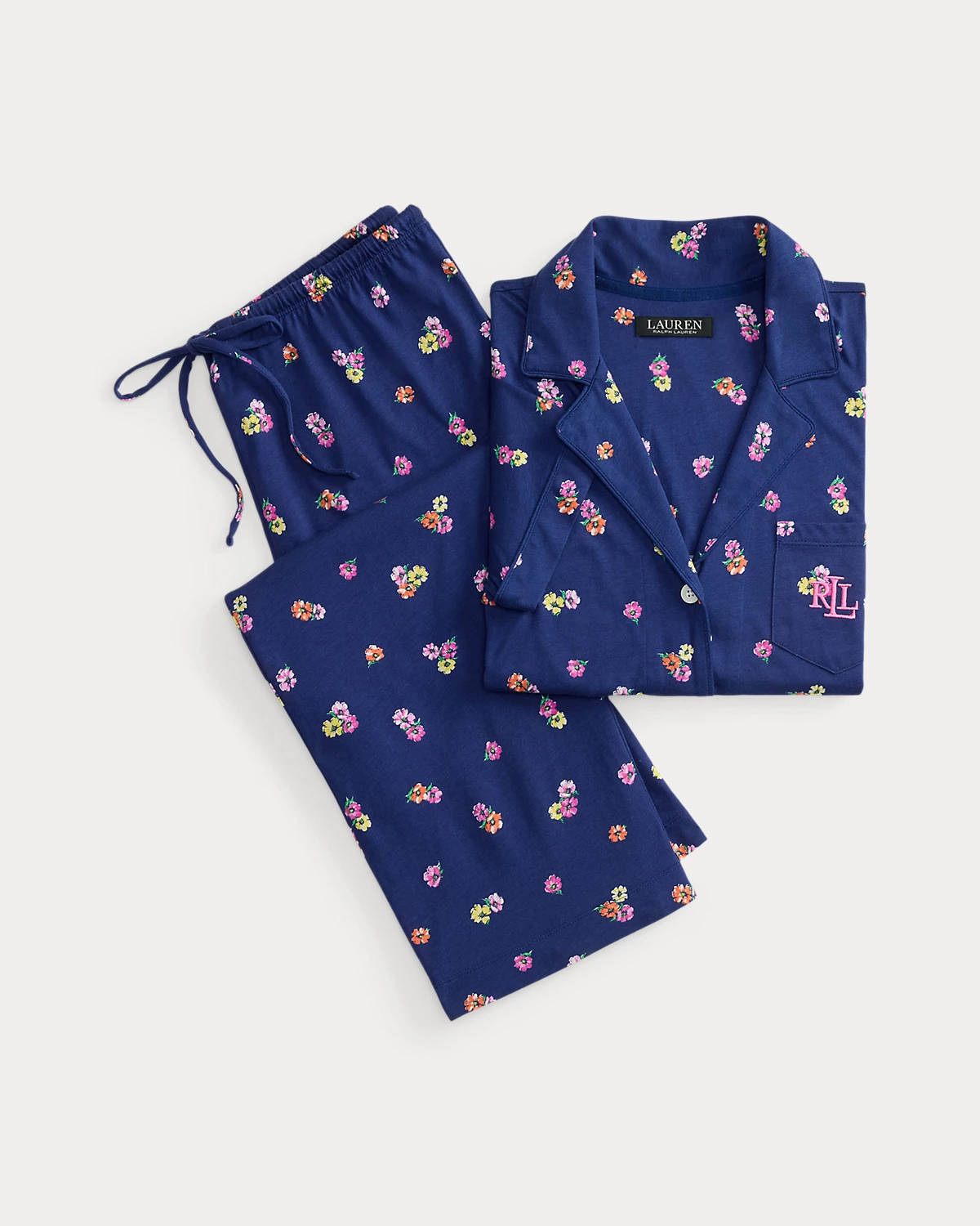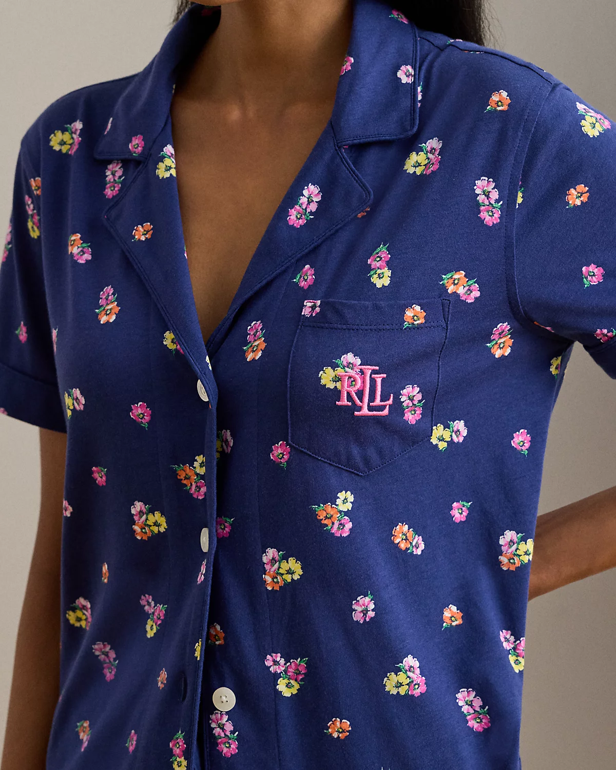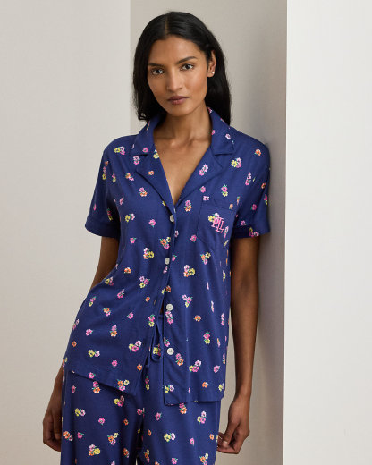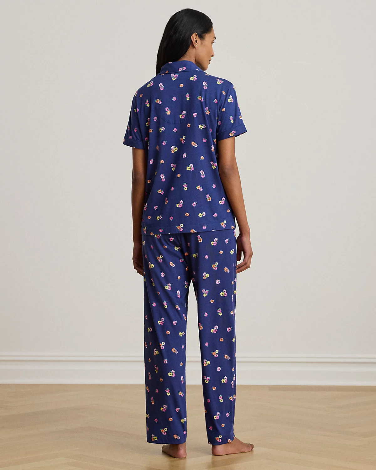 Crafted with soft cotton-blend jersey, this feminine short-sleeve sleep set with drawcord ankle pants displays colorful florals against a navy blue backdrop. Lauren’s signature embroidered logo completes the look.