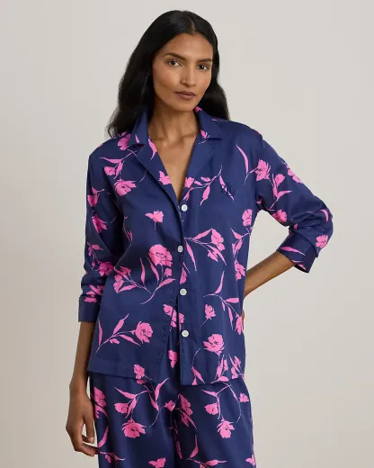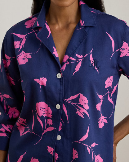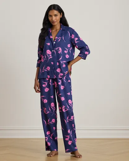 The smooth hand of cotton-blend sateen brings a subtle sheen to this sleep set, which comes with a notch collar shirt and comfortable drawcord pants. This set depicts the season’s two-tone floral print.