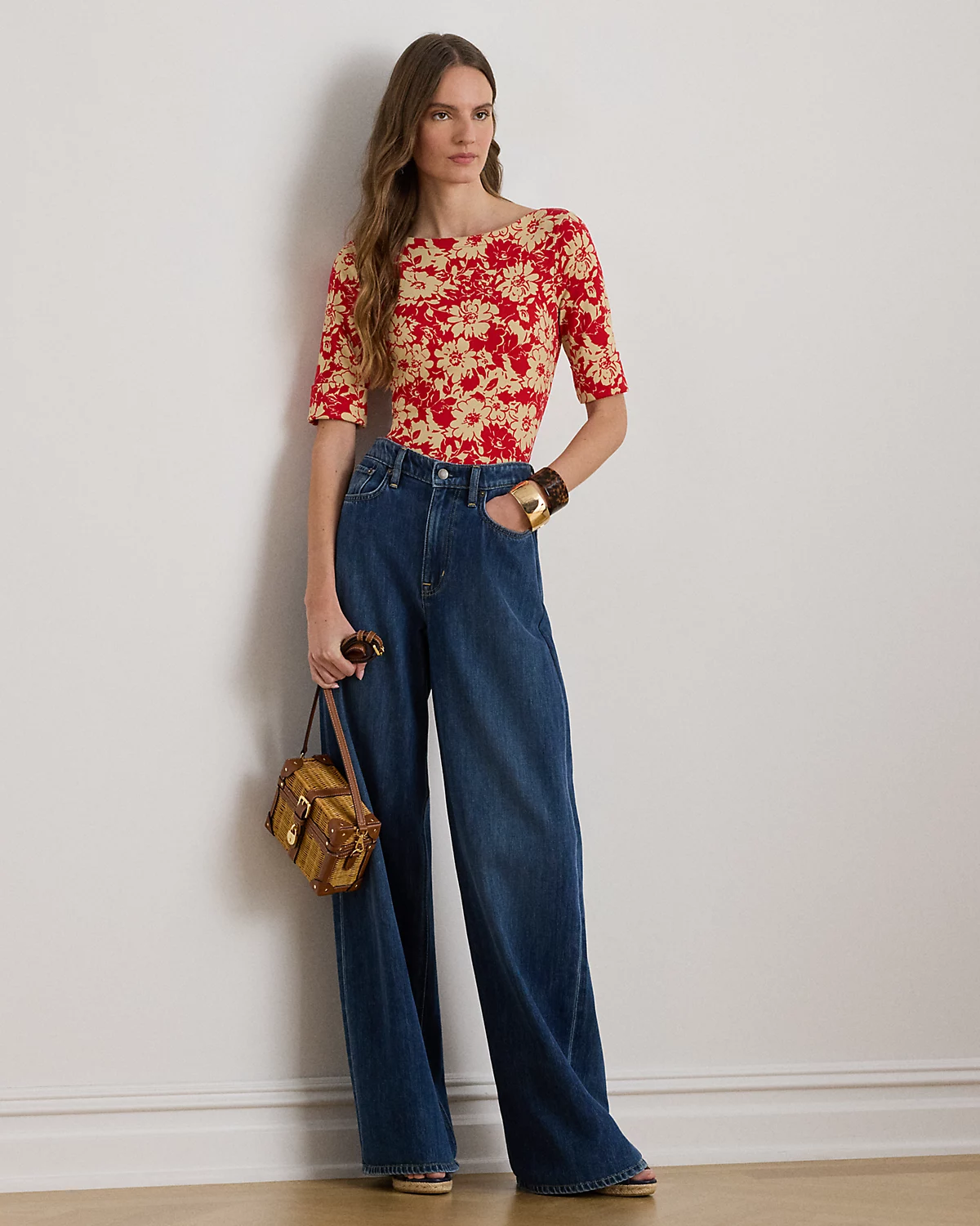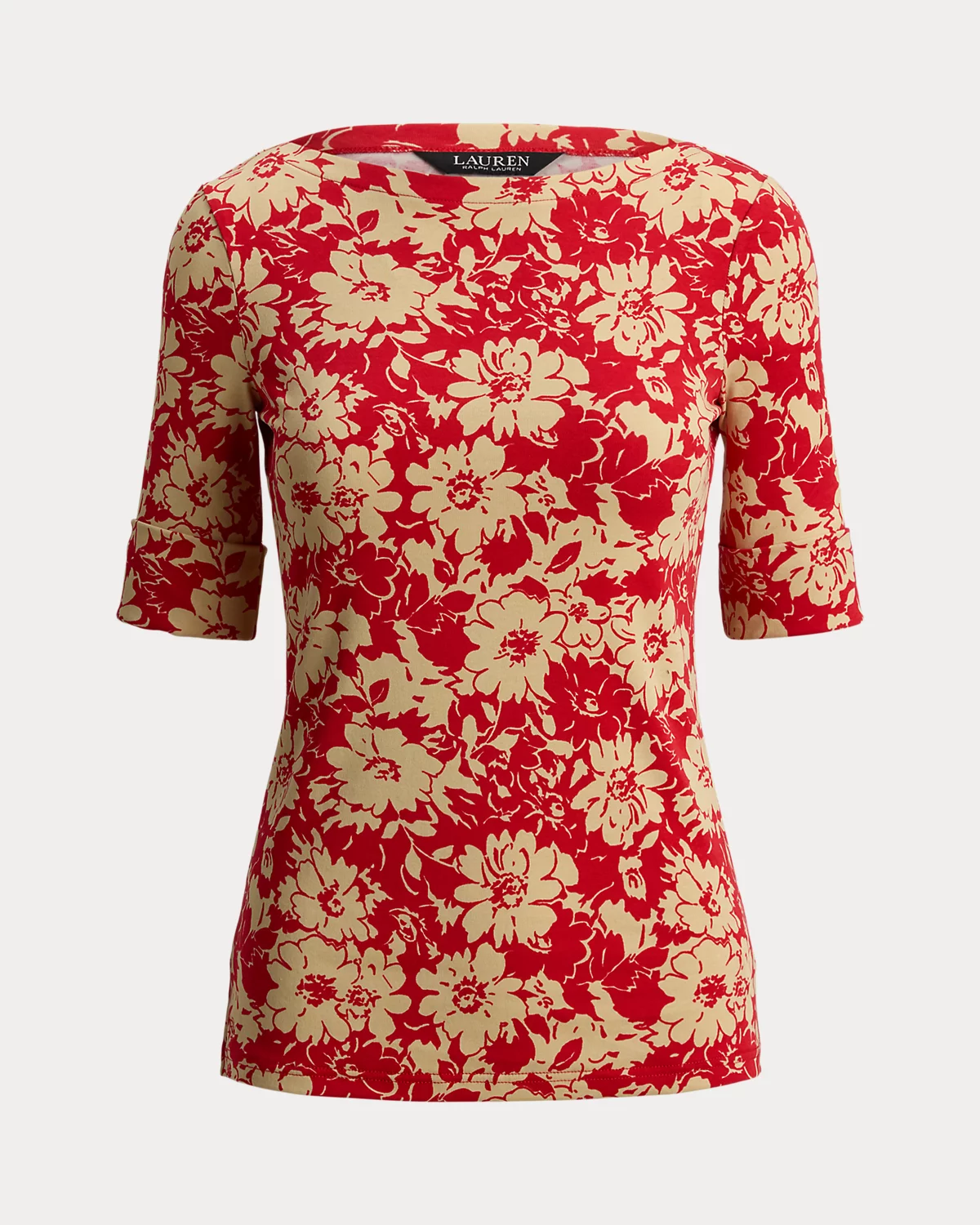 Made with breathable stretch cotton, this boatneck tee is enlivened by the season’s stylized red-and-tan floral print. An “LRL”-embroidered logo at the hem adds a subtle signature finish.
