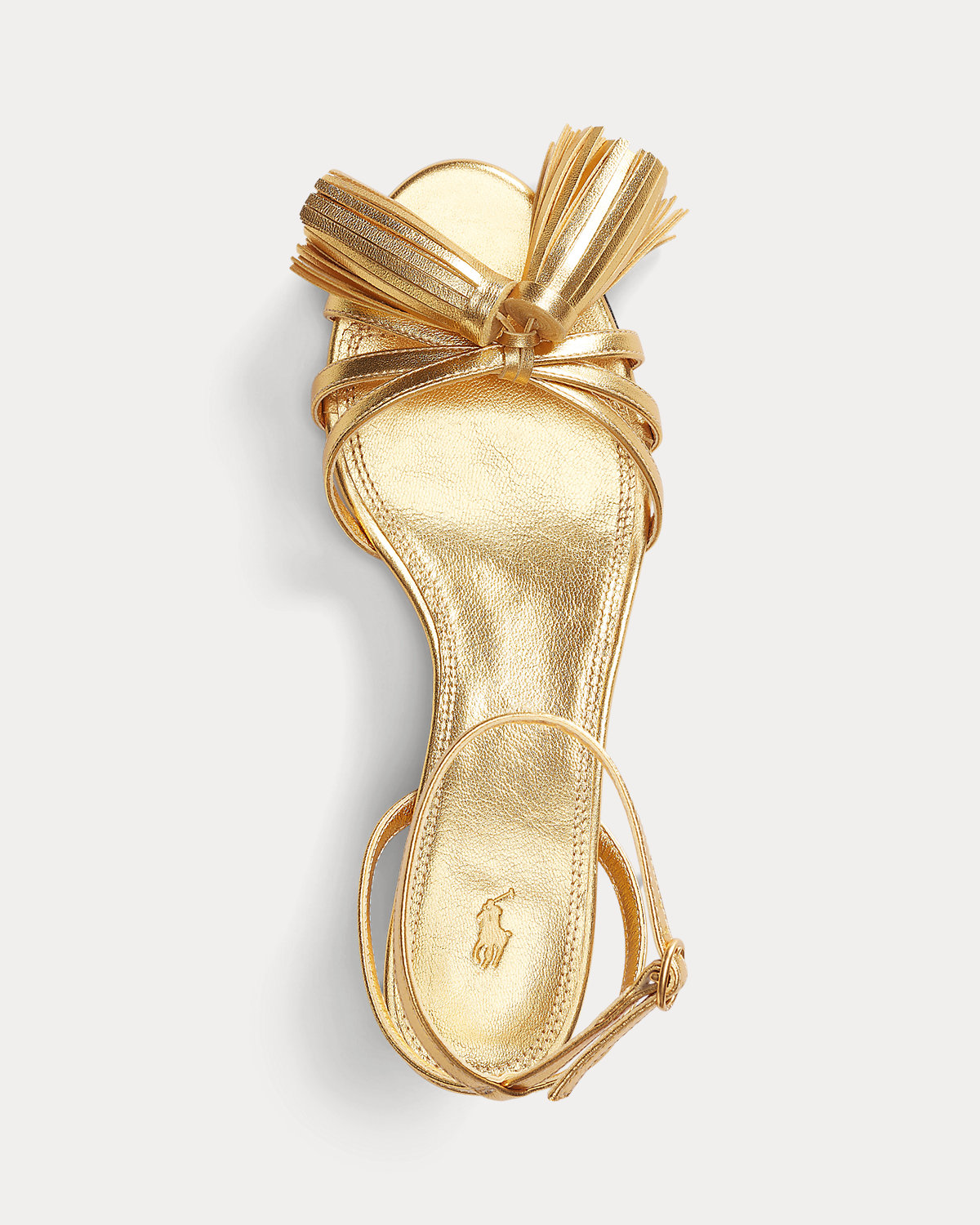 Finely crafted in Spain with metallic-hued leather, this kitten heel features delicate straps and a tassel detail at the vamp.